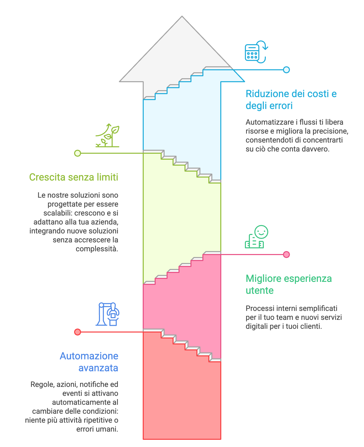 Automatizzare e integrare i flussi di lavoro ti permette inoltre di ridurre i costi operativi e gli errori, liberando tempo e risorse da dedicare alle attività che davvero fanno la differenza per il tuo business. Così puoi concentrarti sugli obiettivi strategici, sapendo che i tuoi sistemi lavorano in sinergia, in modo efficiente e affidabile.