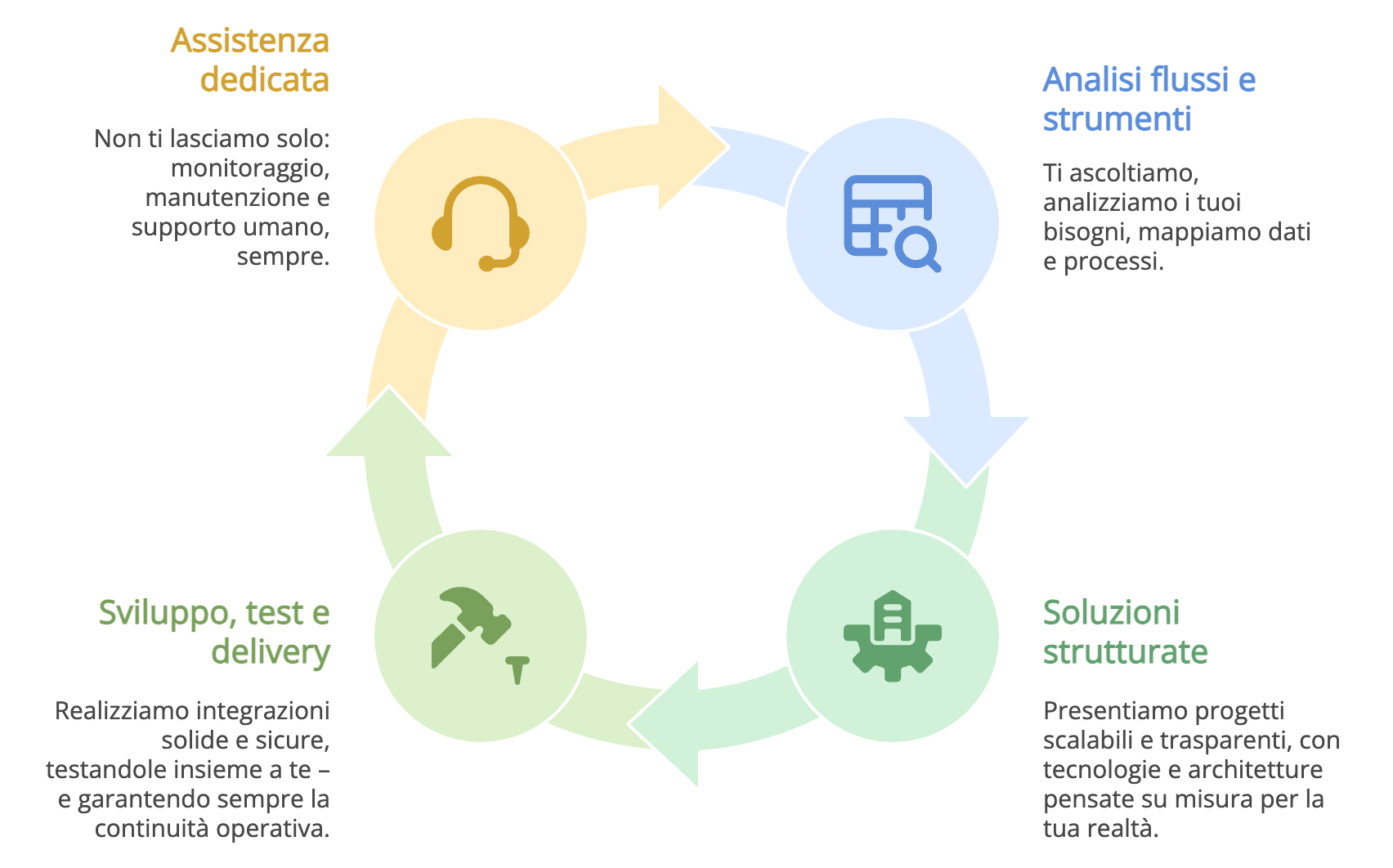 Procediamo poi con la fase di sviluppo, durante la quale realizziamo integrazioni solide e sicure, affiancandoti nei test per garantire che tutto funzioni alla perfezione e assicurando la continuità operativa dell’intero sistema. Il nostro supporto non si ferma con la consegna del progetto: restiamo sempre al tuo fianco con un’assistenza dedicata, che comprende monitoraggio costante, manutenzione e la certezza di un supporto umano, pronto a rispondere a ogni tua esigenza.