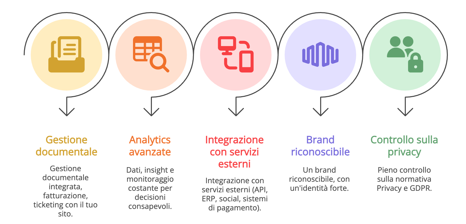- Gestione documentale, fatturazione, ticketing integrati direttamente con il tuo sito o portale