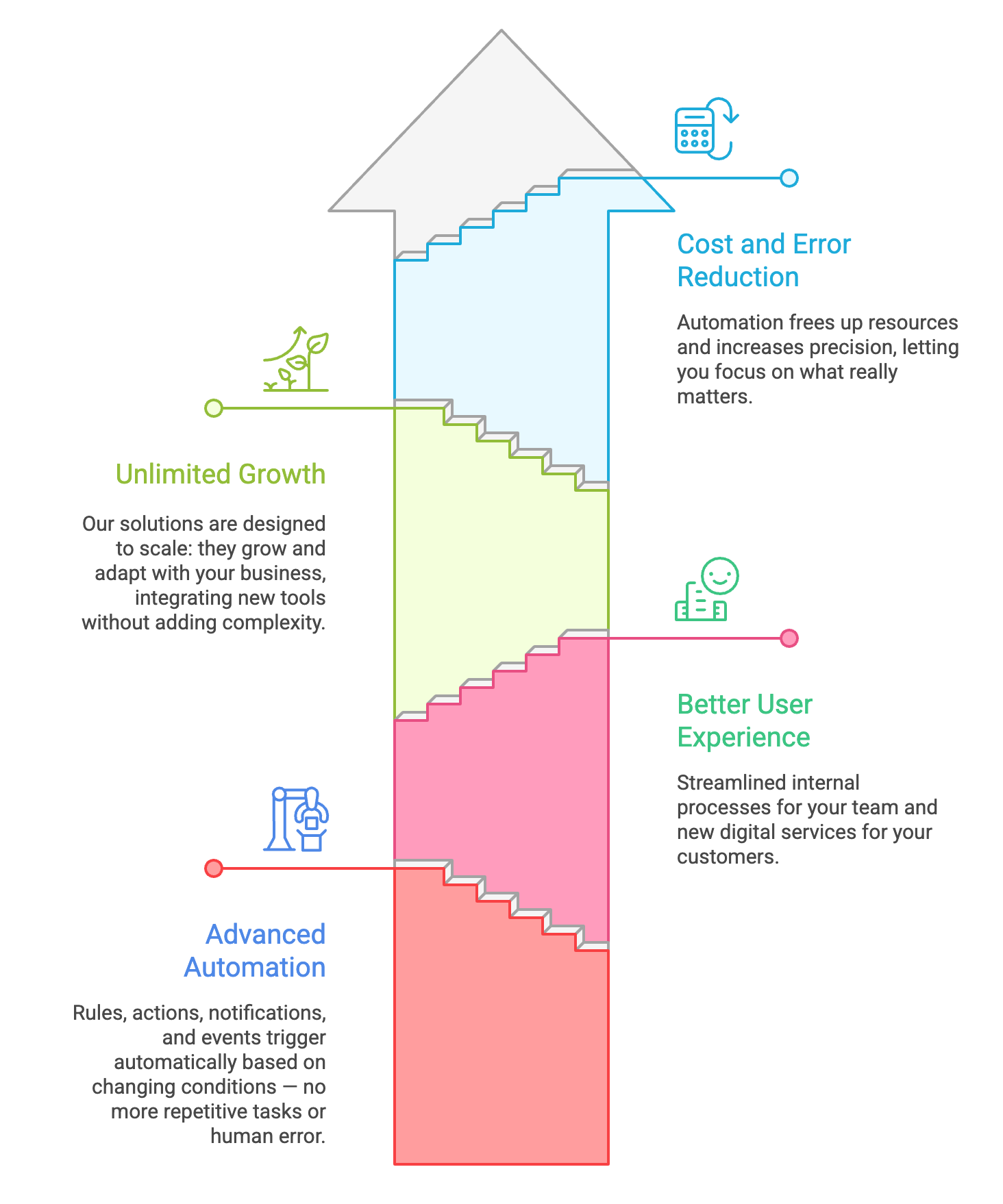 Automating and integrating workflows also allows you to reduce operational costs and errors, freeing up time and resources to focus on activities that really make a difference for your business. This way, you can focus on strategic goals, knowing your systems work together efficiently and reliably.