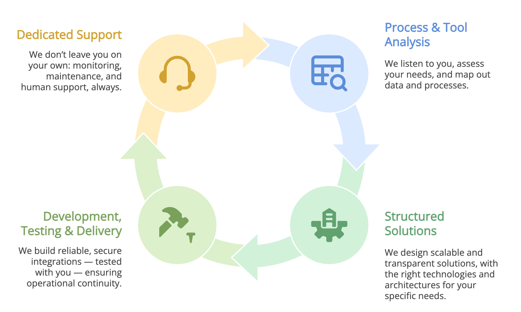 We then proceed with the development phase, during which we create solid and secure integrations, supporting you in testing to ensure everything works perfectly and guaranteeing the operational continuity of the entire system. Our support does not end with the delivery of the project: we remain by your side with dedicated assistance, including constant monitoring, maintenance, and the certainty of real human support ready to respond to your every need.